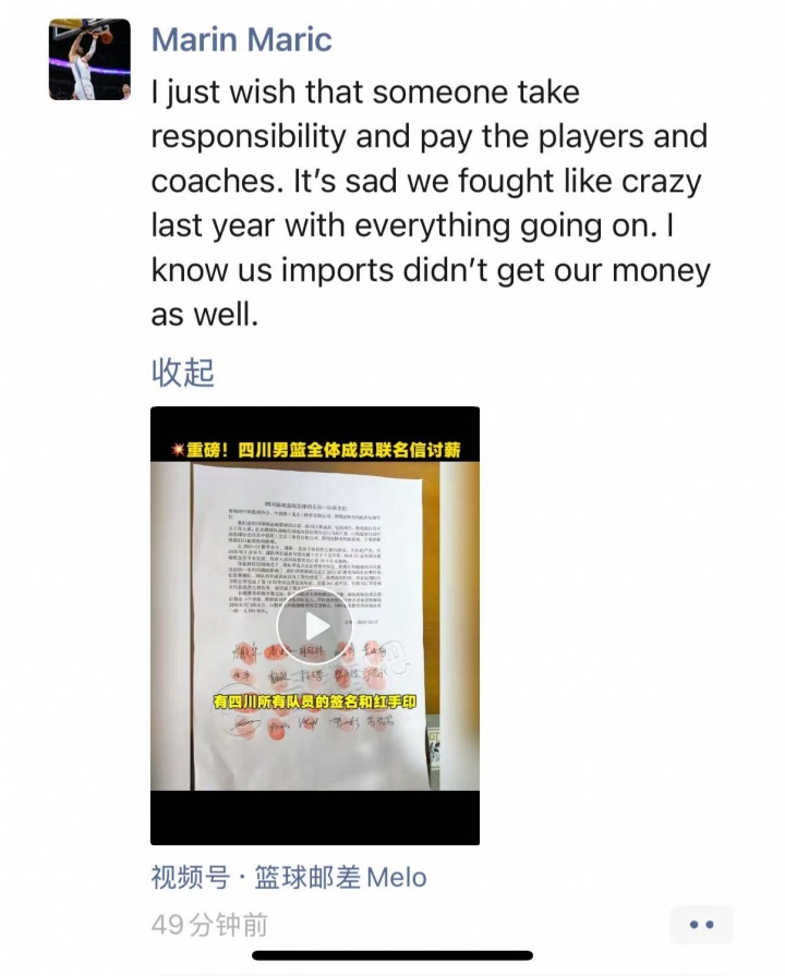 记者获悉,上赛季效力于四川队的内线外援马里奇更新朋友圈,他表示自己也存在欠薪情况。