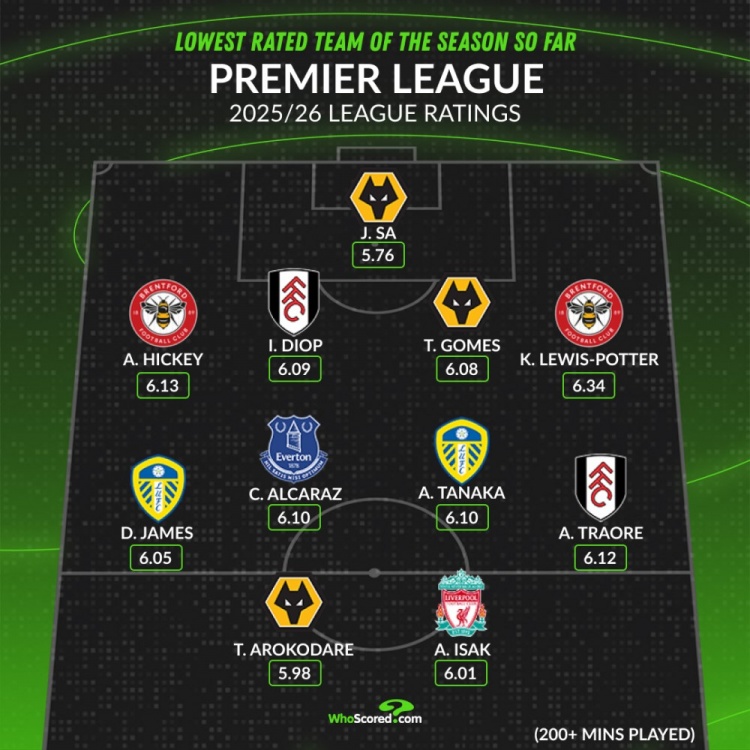 2025-11-20 00:03:14WhoScored本赛季英超评分最低阵容:伊萨克、特劳雷、田中碧在列